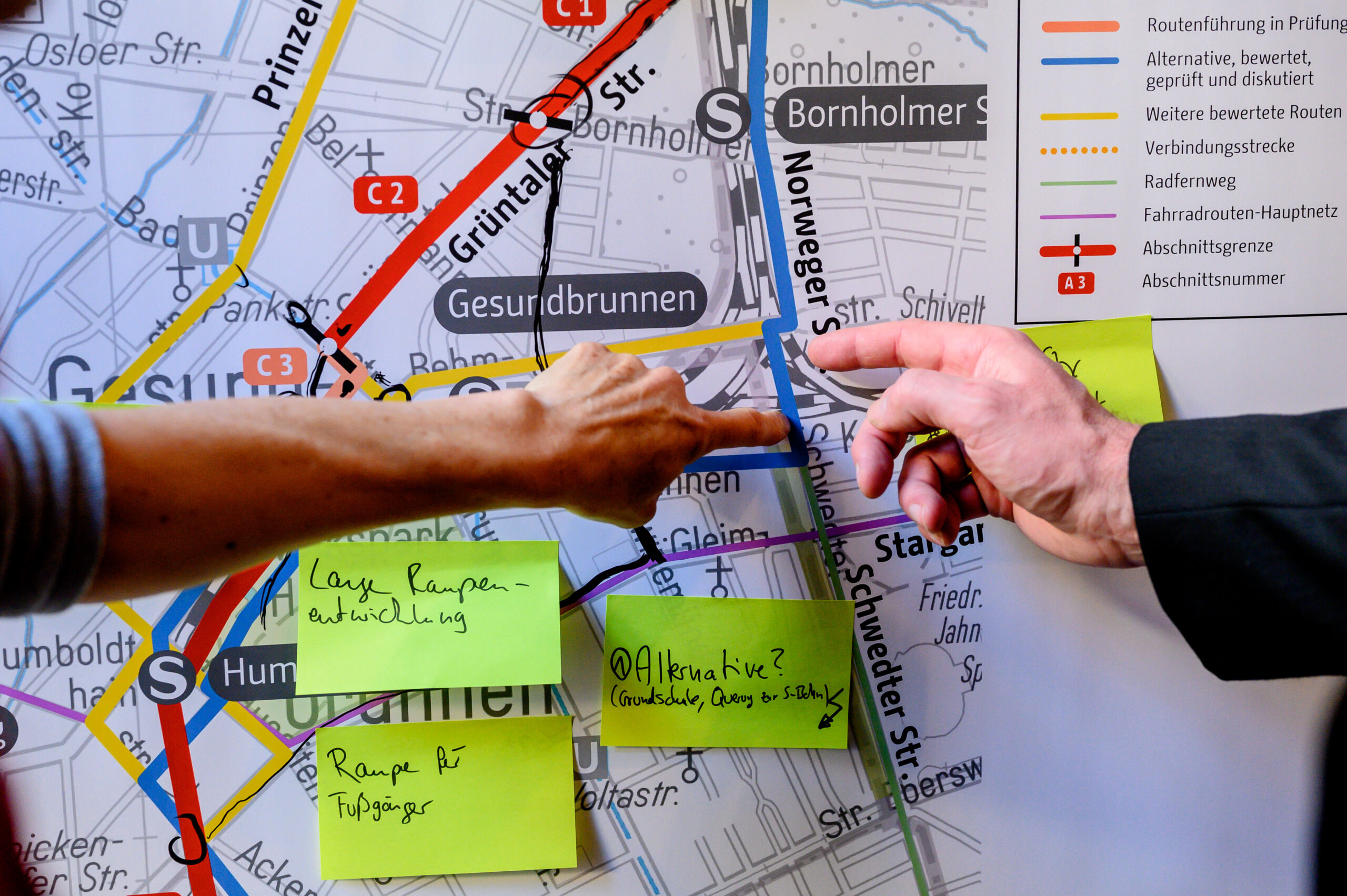 • Vorbereitung von öffentlichen Veranstaltungen in Abstimmung mit infraVelo und wechselnden Planungsteams, Entwicklung des Ablaufs und der Arbeitsmaterialien für Abfragen und Dialoginseln